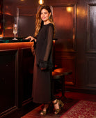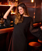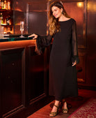 A party showstopper, this chiffon Black Feathered Trim Midaxi Dress hits ankle length and is cut in a loose, free-flowing silhouette. The body is fulled lined but the sleeves are sheer which combined with a plush trim of man-made feathers lining the cuffs, creates a dramatic affect! The round neckline at the front leads into a flattering V-shape at the back, whilst still being bra covering.