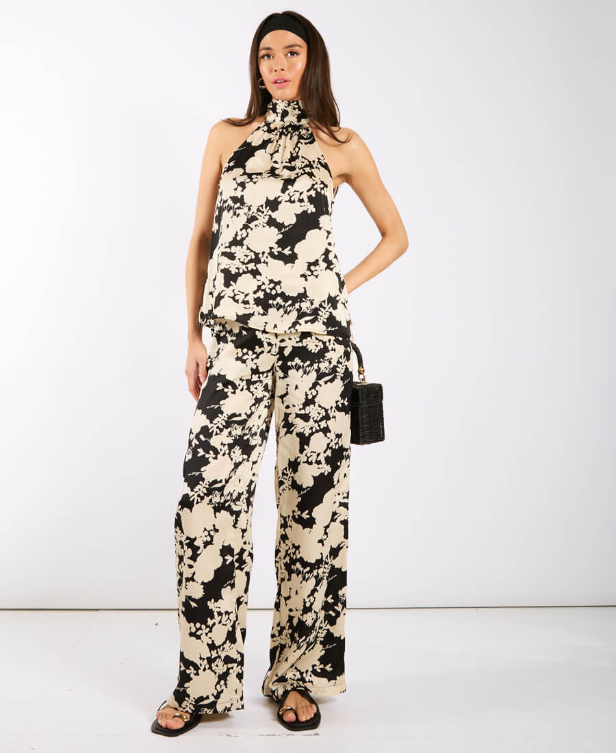 - Halter neck swing style top with tie neck detail at the back. Available in a matching wide leg trouser to create a co-ord