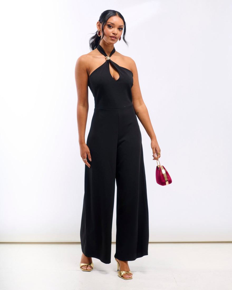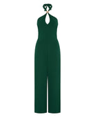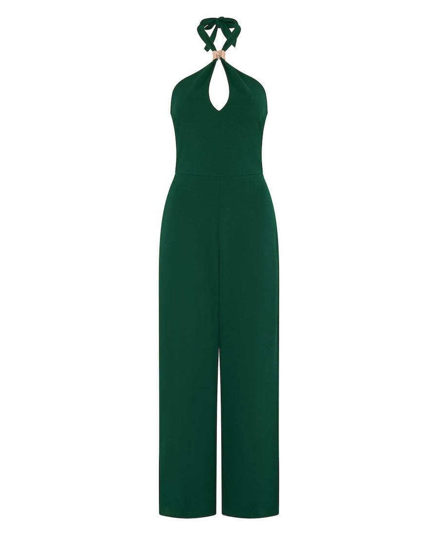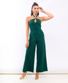 Elevate your evening look with our Green Hardware Halterneck Jumpsuit. Designed in a soft stretch fabric, it features a high neckline with metal hardware detailing and a daring keyhole cut-out for just the right amount of drama. The fitted bodice flows into wide-leg trousers, creating a flattering silhouette.