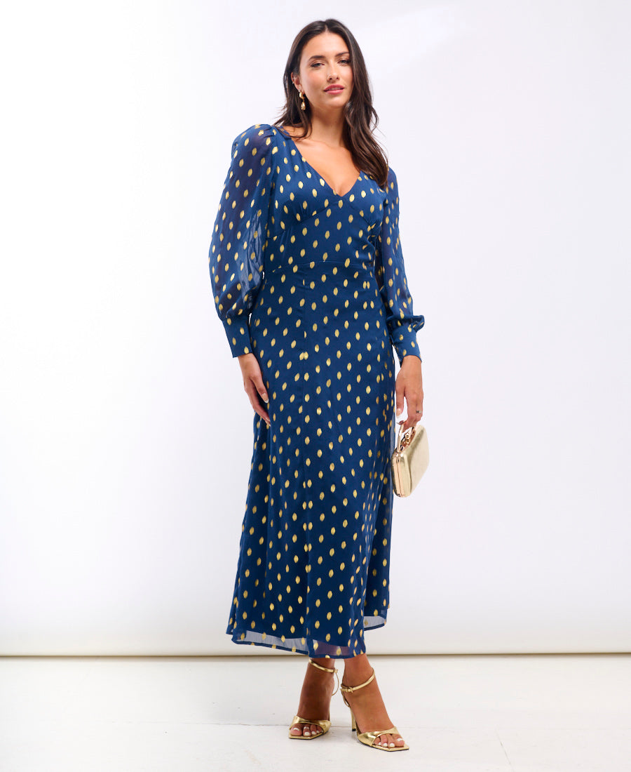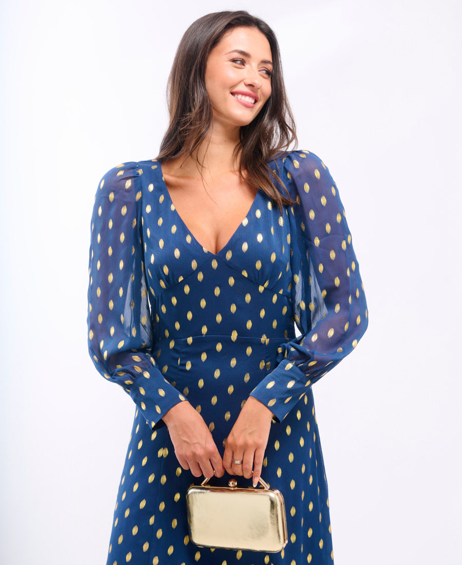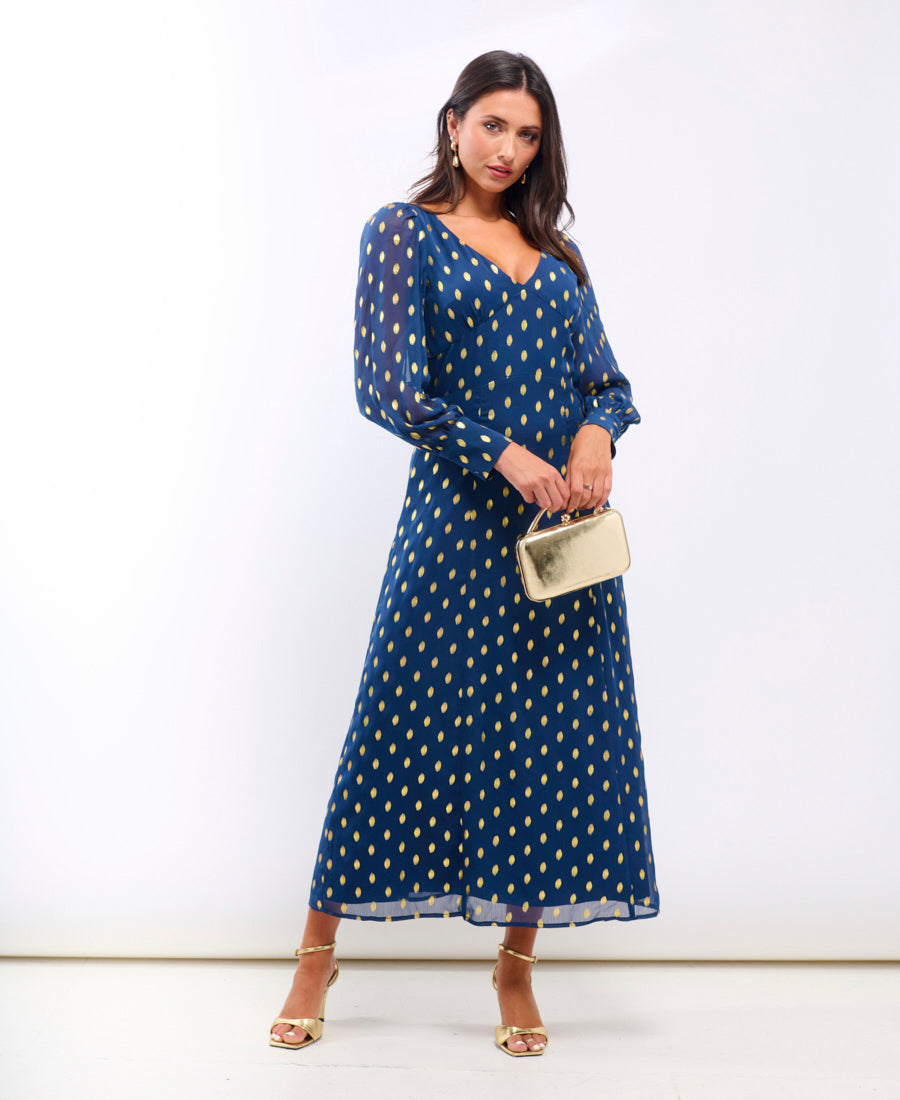 Glisten in style with our Blue Foil Long Sleeve Midi Dress – the perfect style for when you want effortless glamour. Designed with a flattering V-neckline, semi-sheer sleeves, and a fitted bodice that flows into a fluid midi skirt, this dress is finished with all-over gold foil spots that catch the light beautifully. A timeless silhouette with a touch of sparkle, it’s ideal for everything from parties to weddings.