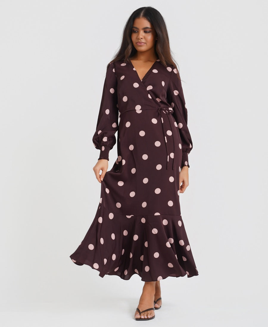 Turn heads in our Spot Wrap LS Midi Dress – a timeless shape with a bold, confident edge. Cut in a flattering wrap silhouette, this dress cinches at the waist to define your figure and flows into a soft, flared hem. The long sleeves are finished with subtle volume and gathered cuffs, adding a touch of elegance. Perfect for day-to-night dressing, this is a wardrobe staple that works all year round