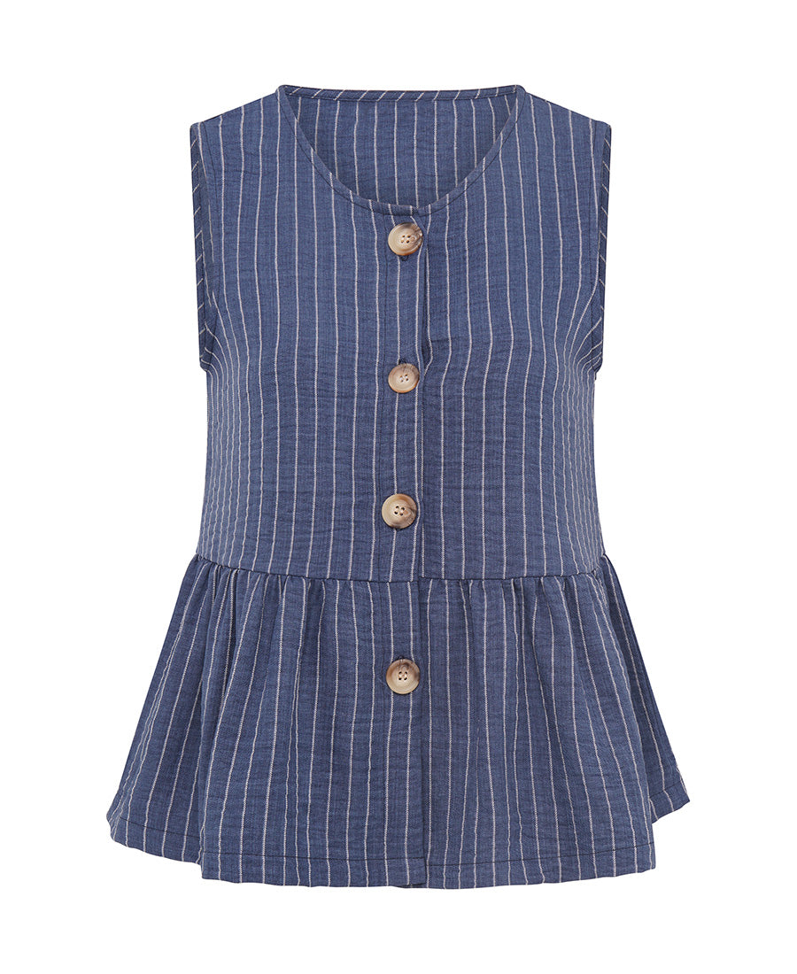 A timeless warm-weather staple with an elevated, effortless feel. Our Blue Stripe Pep Hem Top designed to feel as good as it looks, with a classic pinstripe finish. The softly structured bodice features a round neckline and statement button-through front, flowing into a gently flared peplum hem that flatters the waist without clinging.