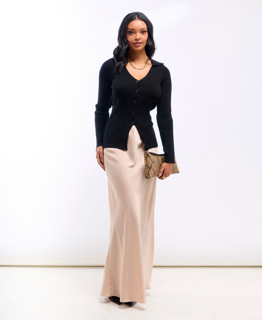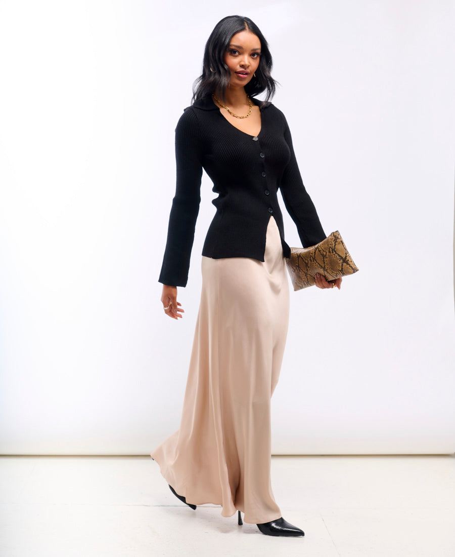 Sleek, Luxurious, and endlessly wearable — meet our Champagne Satin Maxi Slip Skirt, your shortcut to understated glamour. Crafted from a smooth, champagne-hued satin that glides over the body, this skirt is all about fluid movement and effortless sophistication.