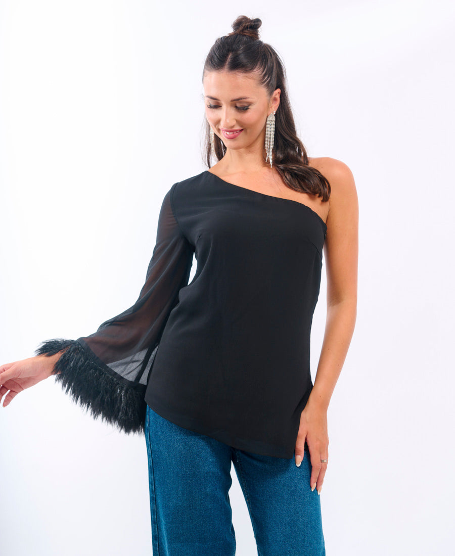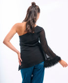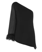 The ultimate piece for nights out and special occasions. Our Feather Asymmetric Top – Designed with a bold one-shoulder cut, this top features a floaty chiffon sleeve finished with luxe feather cuff detailing.