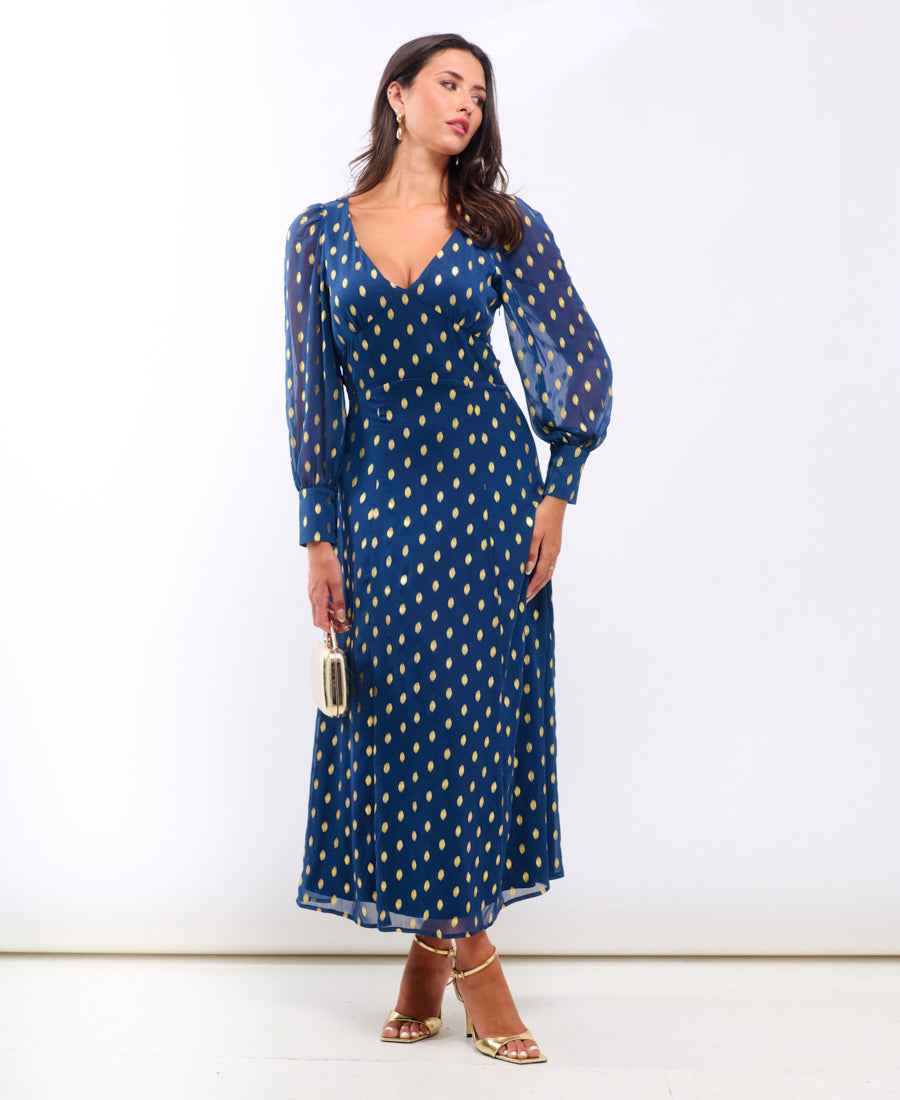 - Petrol blue chiffon base with all-over gold foil spots