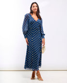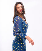 Glisten in style with our Petrol Blue Foil Plunge Midi Dress – the perfect style for when you want effortless glamour. Designed with a flattering V-neckline, semi-sheer sleeves, and a fitted bodice that flows into a fluid midi skirt, this dress is finished with all-over gold foil spots that catch the light beautifully. A timeless silhouette with a touch of sparkle, it’s ideal for everything from parties to weddings.