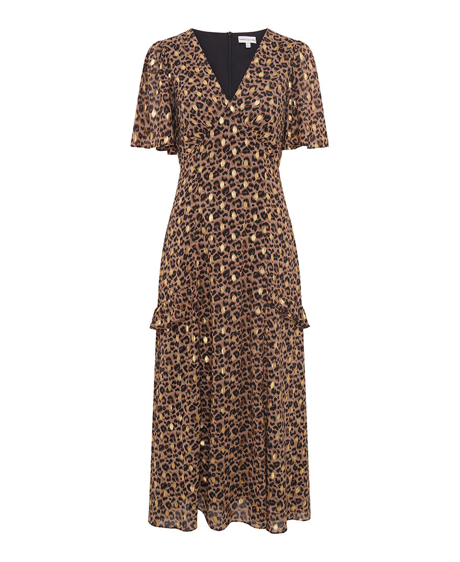 Designed to flatter with effortless elegance, this Ruffle Animal Foil Midi Dress is the perfect balance of femininity and understated glamour. Crafted in a soft leopard print with subtle gold foil detailing, it catches the light beautifully while remaining easy and wearable. The softly draped V-neckline and gently shaped waist create a flattering silhouette, while the fluid skirt moves effortlessly with every step.